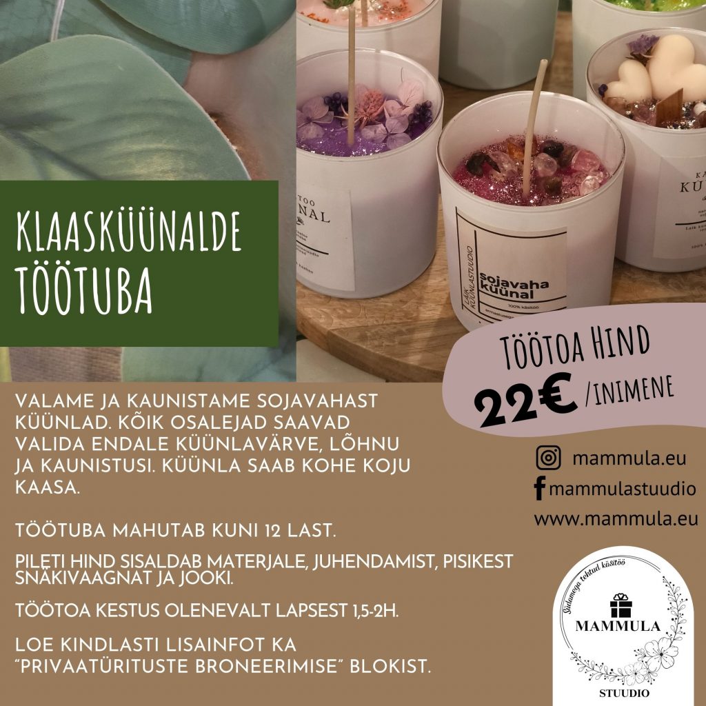 NB! Küünalde töötuppa pole kahjuks läbi kalendri võimalik broneeringuid teha kuna töötuba viib läbi külalisjuhendaja. Kui Sa soovid sünnipäevaks küünalde töötuba, siis palun kirjuta mammula@mammula.eu ja leiame Sulle sobiva aja 🥰
