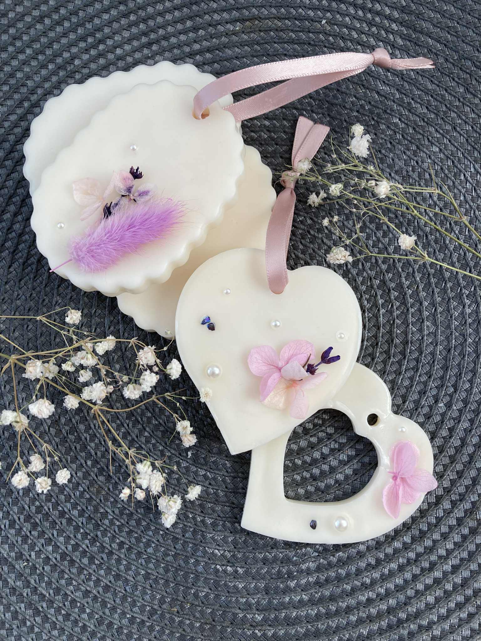 Aroomivahad valmivad tervisele ohutust sojavahast ja neid saab lõhnastada eeterlikke õlidega. Kaunistuseks on laual erinevaid kuivatatud lilli, pärleid, glitrit jne.