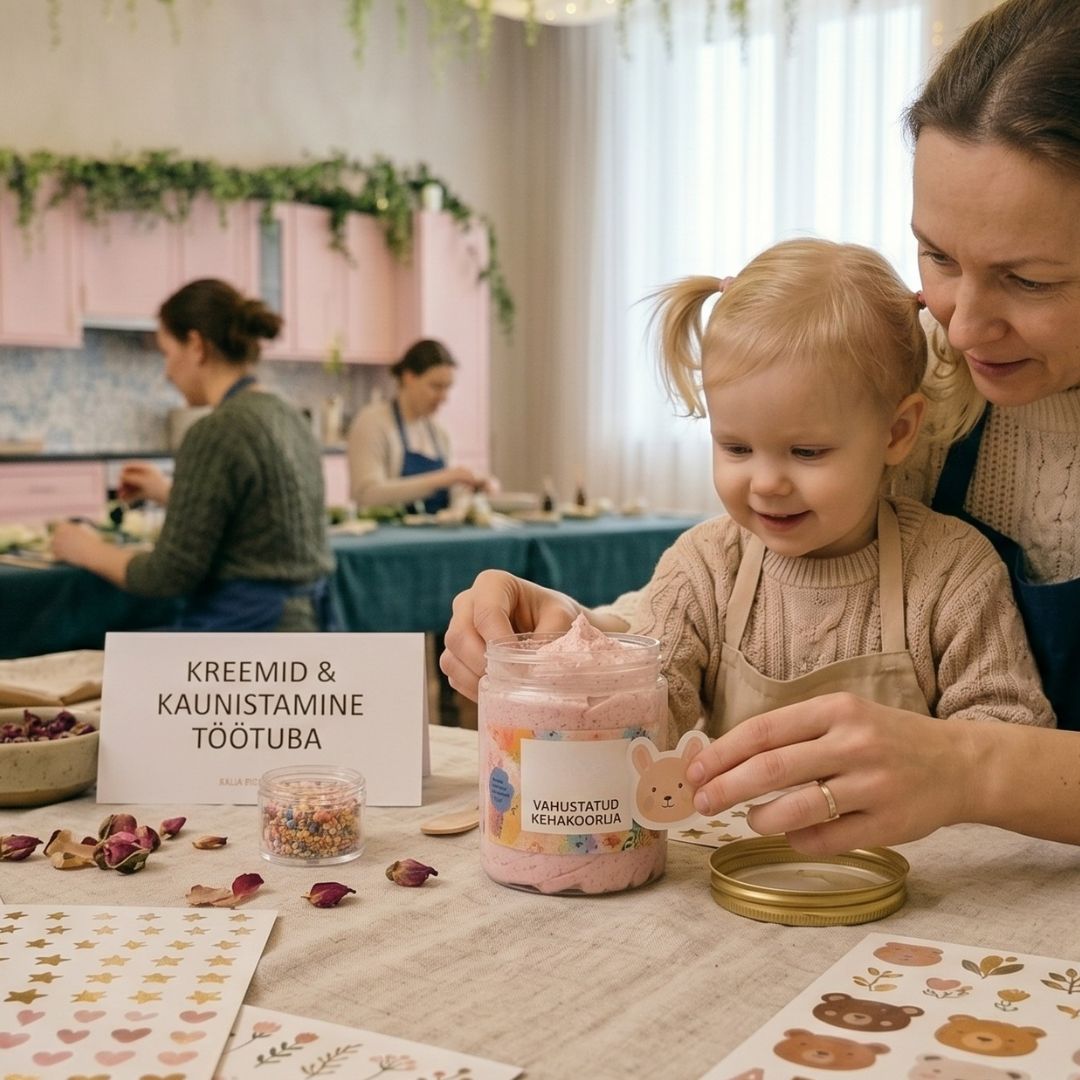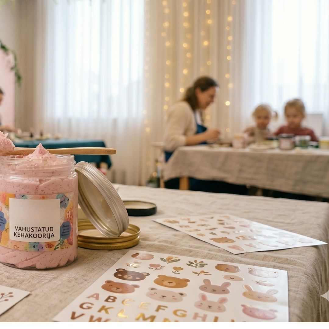 Iga laps saab valida endale meelepärase värvi, lõhna ja sädeluse ning hiljem ka oma kehakoorija purki pakendada ning kaunistada.